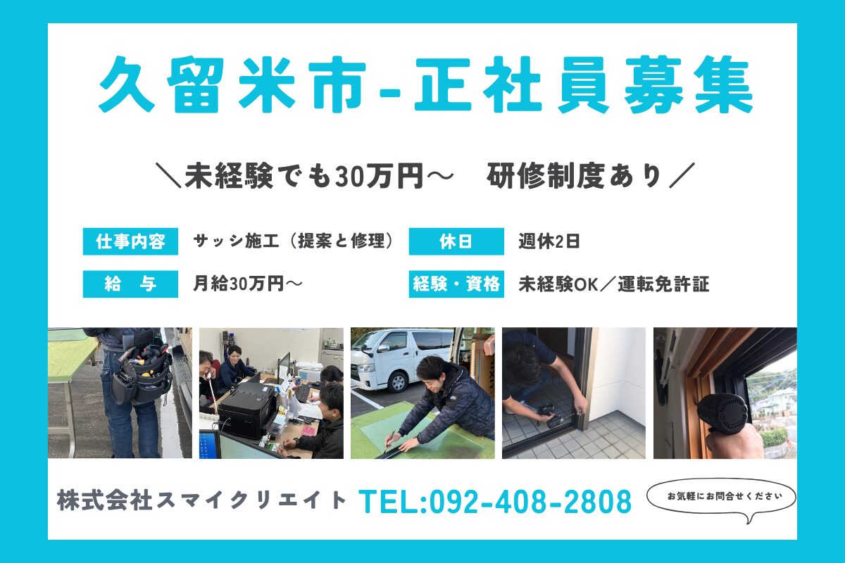 久留米市の求人【正社員】サッシ施工スタッフ未経験者歓迎!月給30万円~|賞与年2回|週休2日