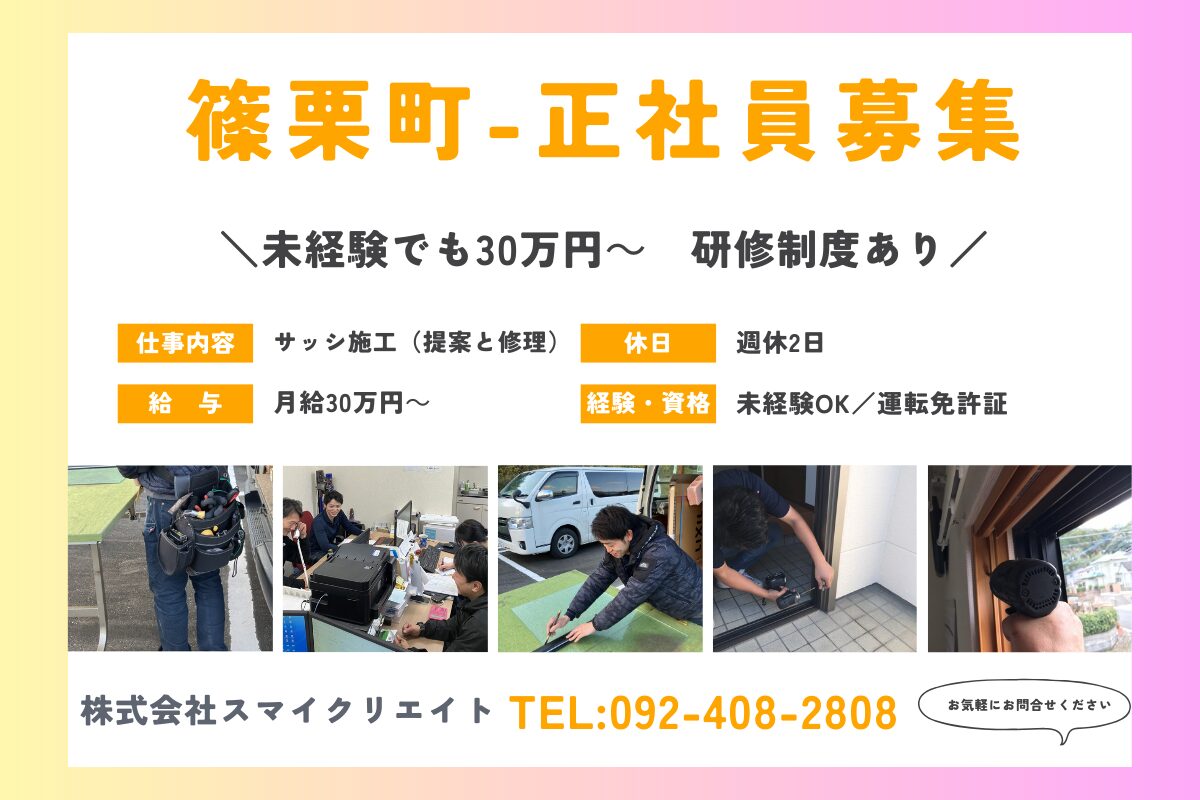 篠栗町の求人【正社員】サッシ施工スタッフ未経験者歓迎!月給30万円~|賞与年2回|週休2日